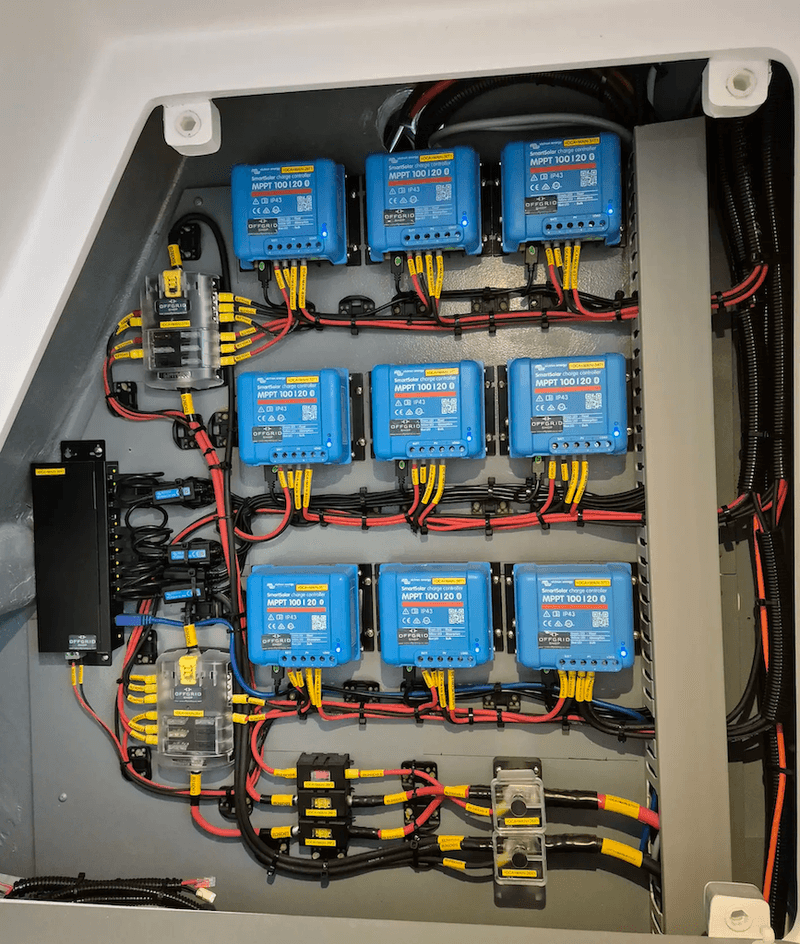 A custom-made 2.6kW SOLBIAN solar system is installed in the saloon roof, making it fully accessible. Nine SmartSolar 100/20 charge controllers control the solar harvest in a synchronized manner and ensure maximum shade tolerance with separate control circuits.
