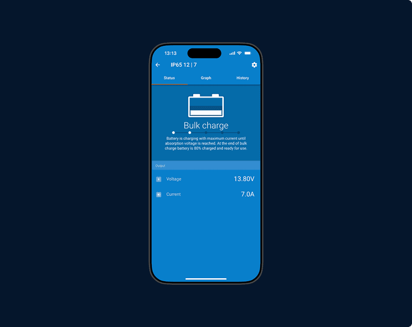 Den kostnadsfria VictronConnect-appen för Android eller iOS låter dig justera laddningsprofiler, spåra realtidsstatus och visa användningshistorik, så att du kan ha kontroll utan att röra laddaren.