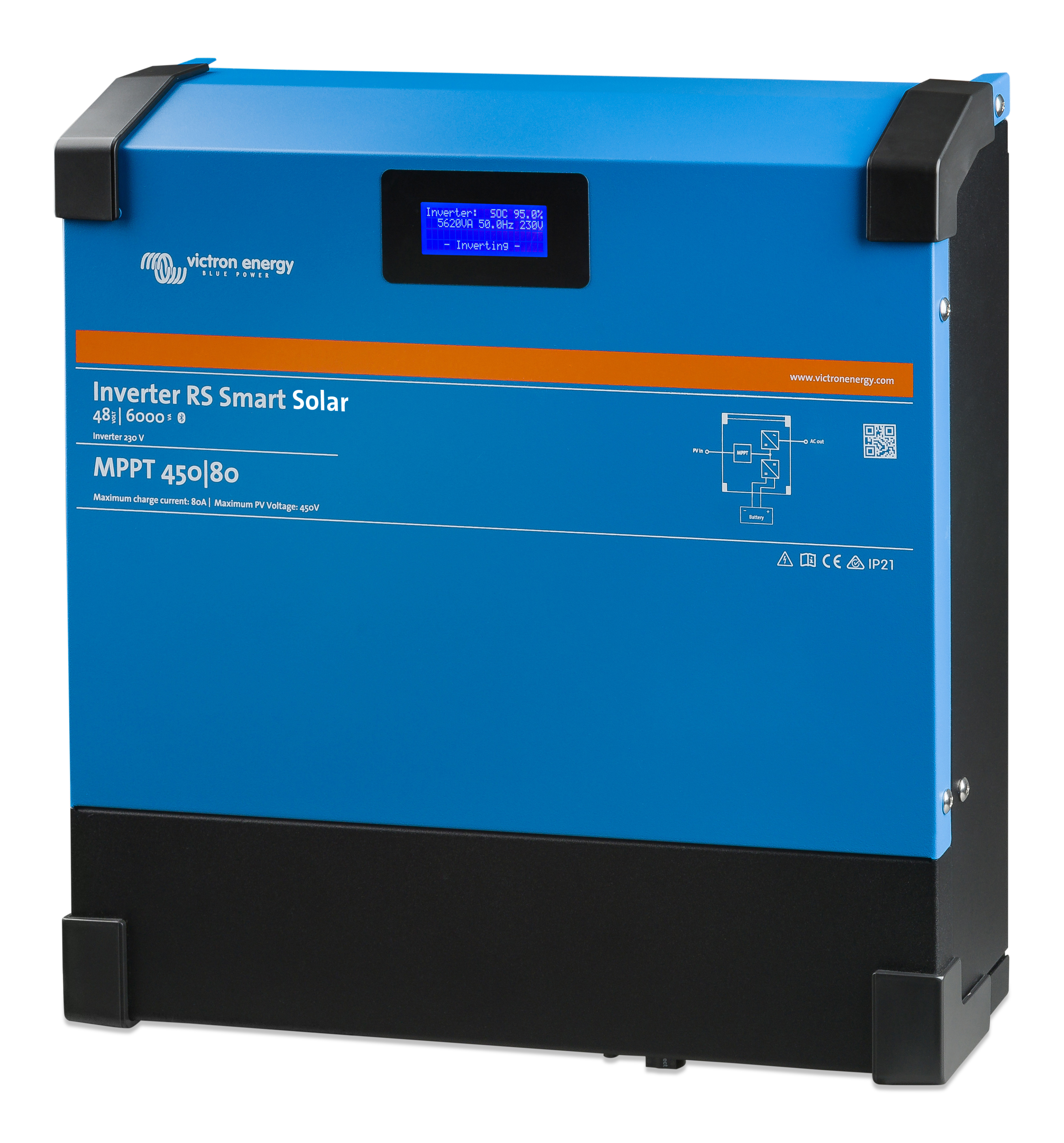 Växelriktaren RS Smart Solar är en kombination av en kraftfull växelriktare på 48 VDC, 6 kVA och 230 VAC och en MPPT-solcellsladdare för hög spänning på 80-450 VDC och 4 kW. Tack vare dess moderna design och högfrekvensteknik väger växelriktaren endast 11 kg och har en utmärkt prestanda, låg förbrukning i viloläge och är väldigt tyst i drift.